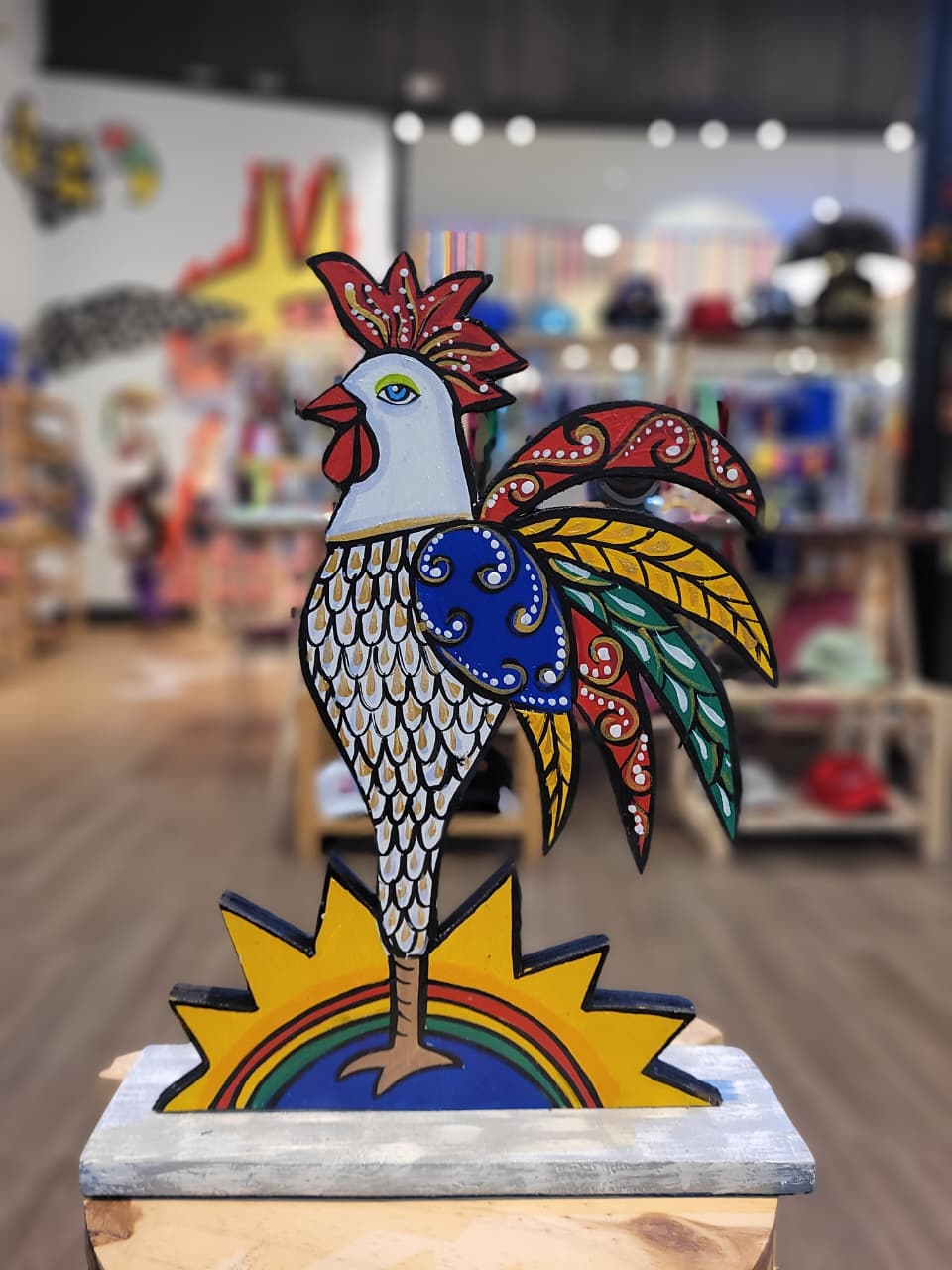 O Galo da Madrugada, na interpretação de João Andrade, ganha forma em madeira compensada como síntese da maior manifestação carnavalesca de Recife. Com 28 cm de altura, a escultura traduz, em escala íntima, a exuberância e o ritmo do frevo que arrasta multidões. A obra condensa a força do imaginário popular, preservando a memória e a alegria vibrante que definem essa tradição.