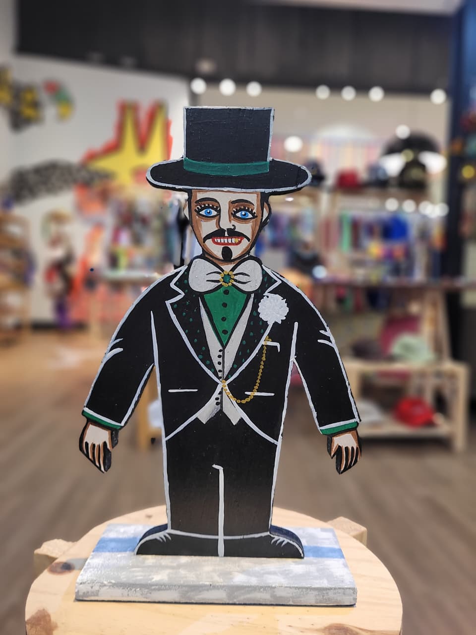 A escultura do Homem da Meia‑Noite, de João Andrade, traduz em madeira compensada a grandiosidade do ícone máximo do Carnaval de Olinda. Com 29 cm de altura, a peça captura o mistério e a imponência do boneco criado em 1931, que abre as festividades à meia‑noite. Em escala íntima, a obra preserva a memória coletiva, a força simbólica e o imaginário popular que atravessam gerações nas ladeiras históricas da cidade.