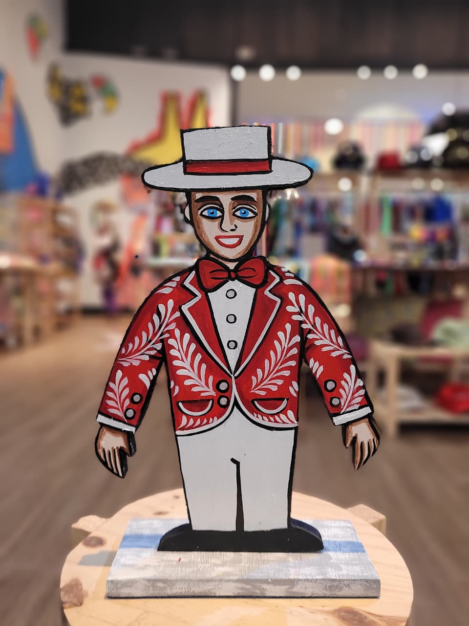 O “Menino da Tarde”, de João Andrade, traduz em madeira compensada a tradição dos bonecos gigantes de Olinda. Com 27 cm de altura, a peça homenageia o bloco criado em 1974, símbolo da cultura carnavalesca local e integrante da família do Homem da Meia-Noite. Na escala íntima, a obra condensa a memória coletiva, o imaginário popular e a vitalidade do frevo, reafirmando o vínculo do artista com as expressões vivas do carnaval pernambucano.